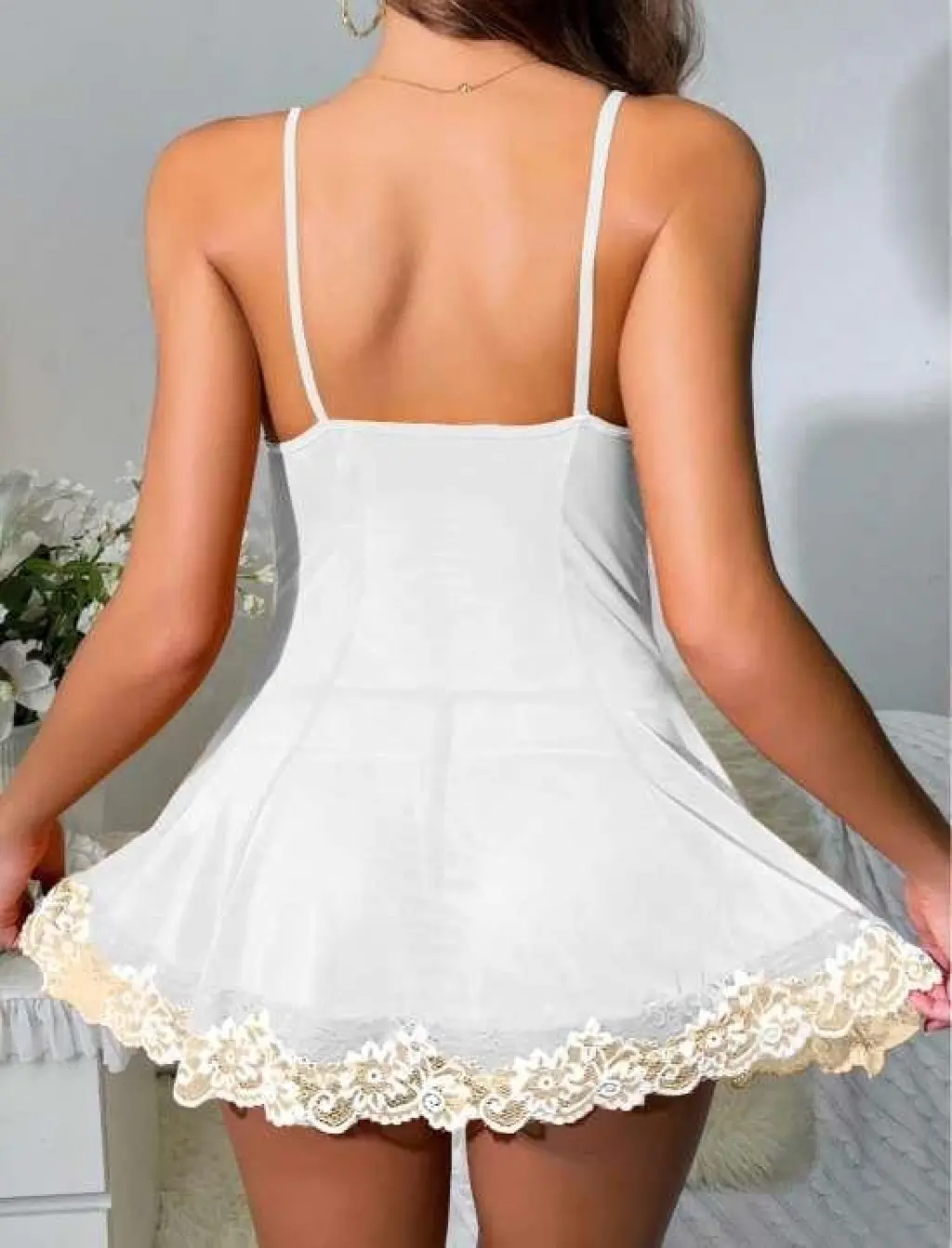 • Beyaz Dantel İşlemeli İnce Askılı Likralı Fantezi Tül Gecelik