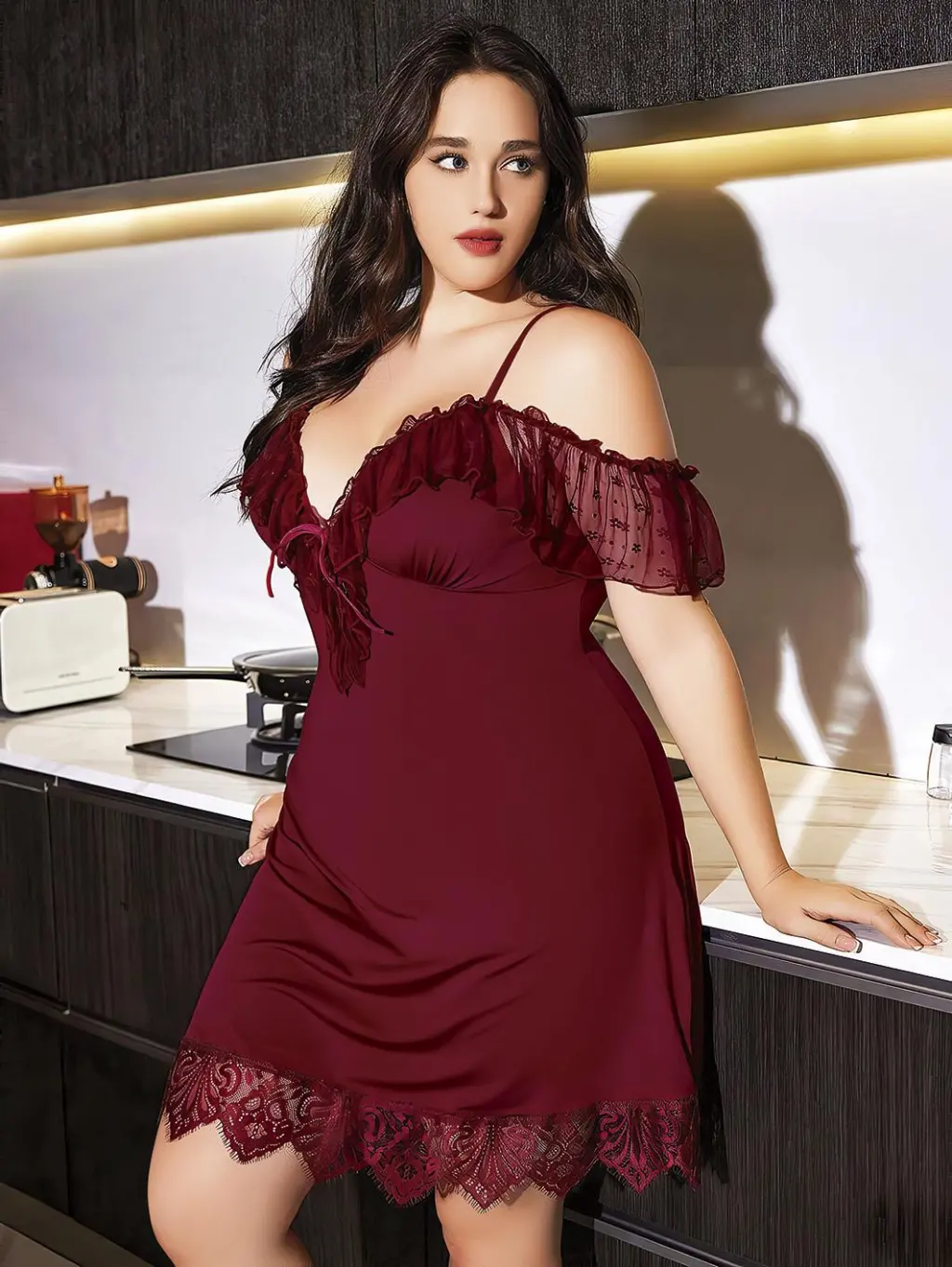 • Büyük Beden Bordo Dantel İşlemeli İnce Askılı Gecelik