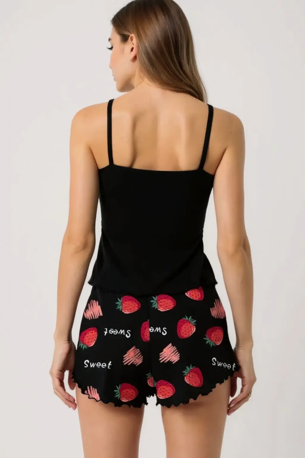 LYYN Çilek Baskılı Siyah Askılı Şortlu Pijama Takımı