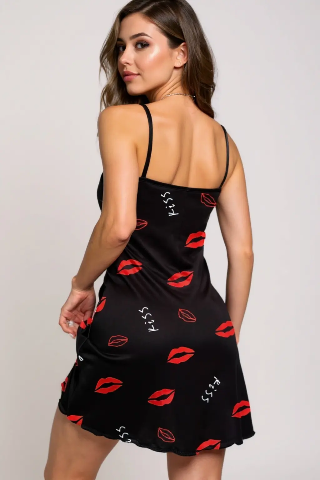 LYYN Dudak Desenli Siyah Askılı Gecelik