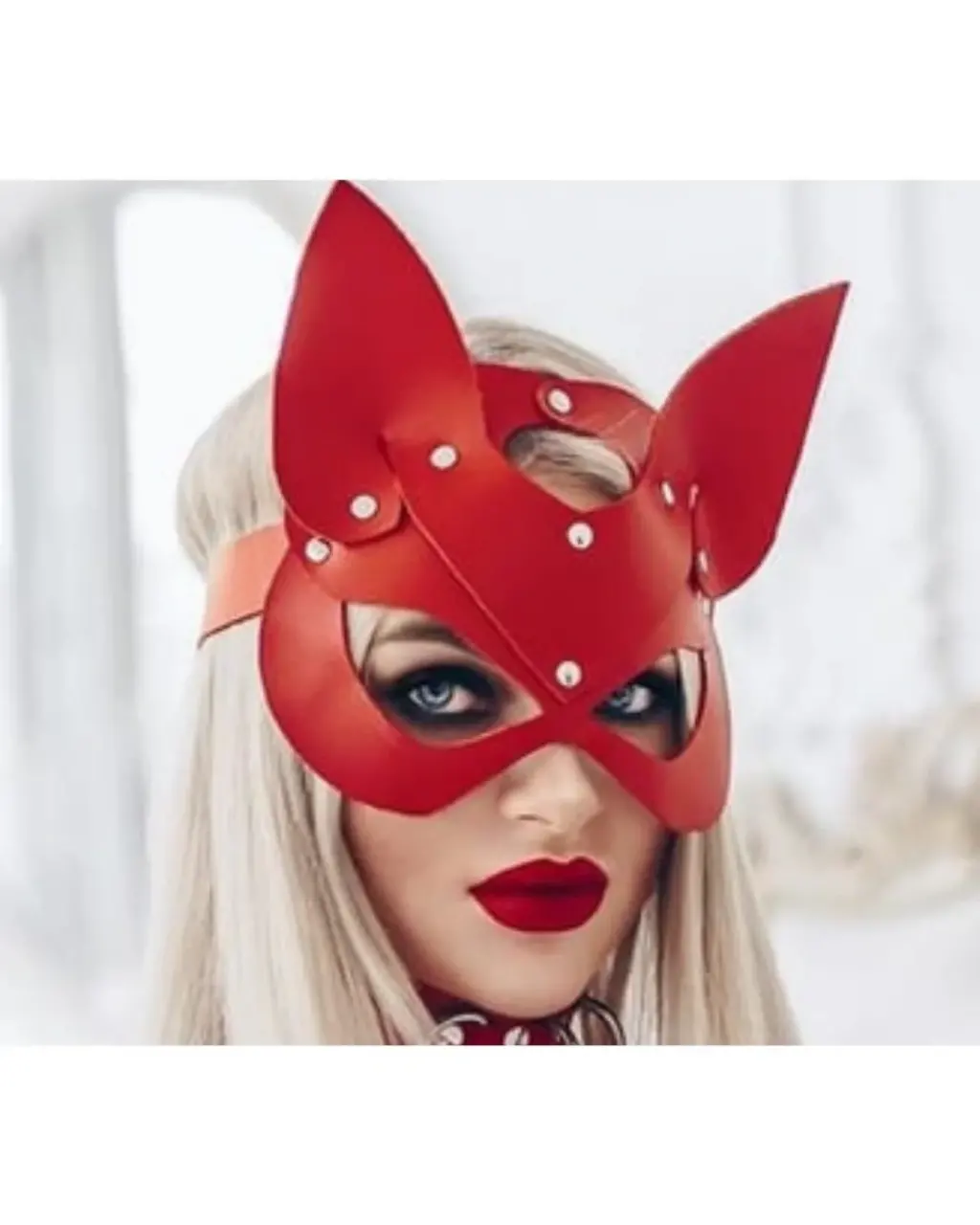 LYYN Fantezi Deri Seksi Kırmızı Kedi Maske Kelepçe Kırbaç Seti ( 3'lü Set)