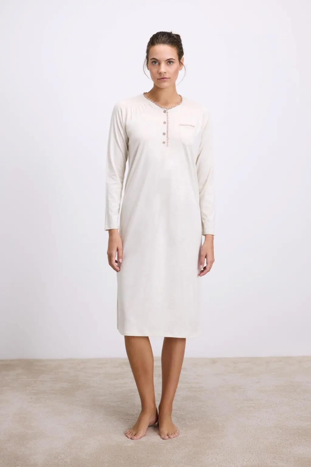 • Fil Dişi Modal Uzun Kollu Düğmeli Gecelik