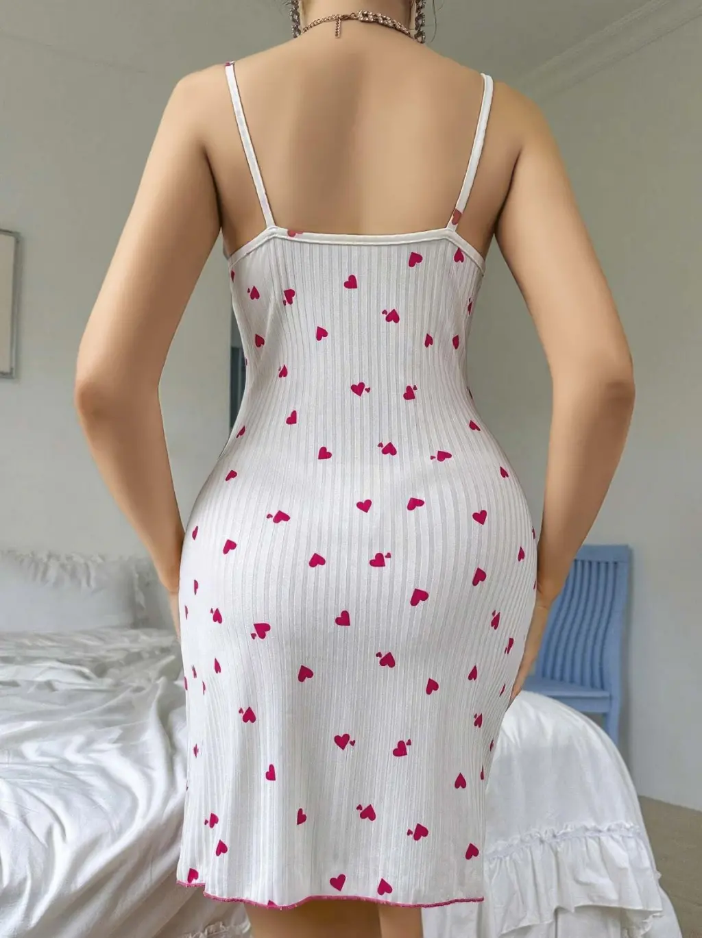 • Kadın Beyaz Kırmızı Kalp Desenli Yandan Dantel Detaylı Askılı Elbise 5070