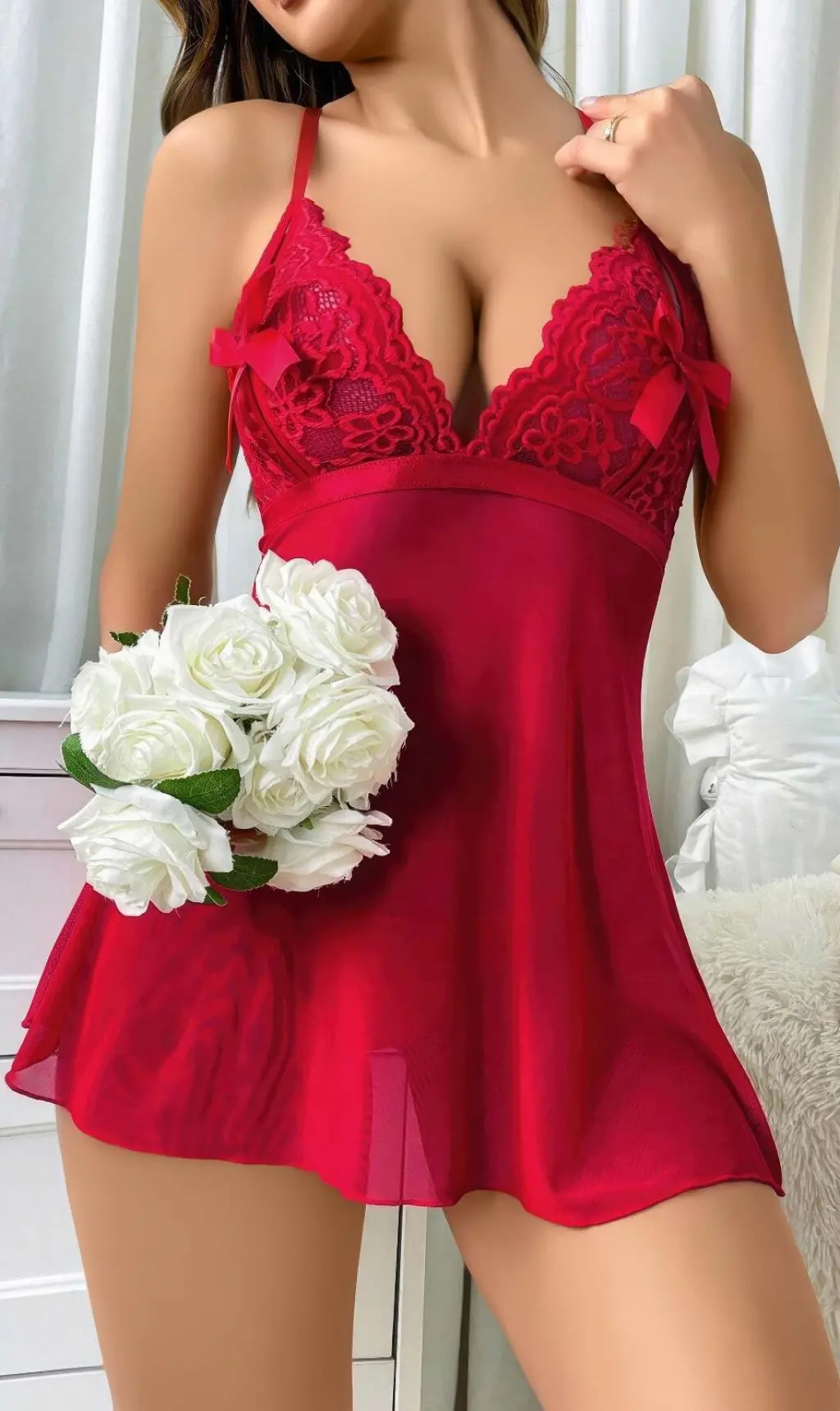 • Kadın Kırmızı Fantazi Gecelik Kısa Tül Göğüs Fiyok Detaylı 2097
