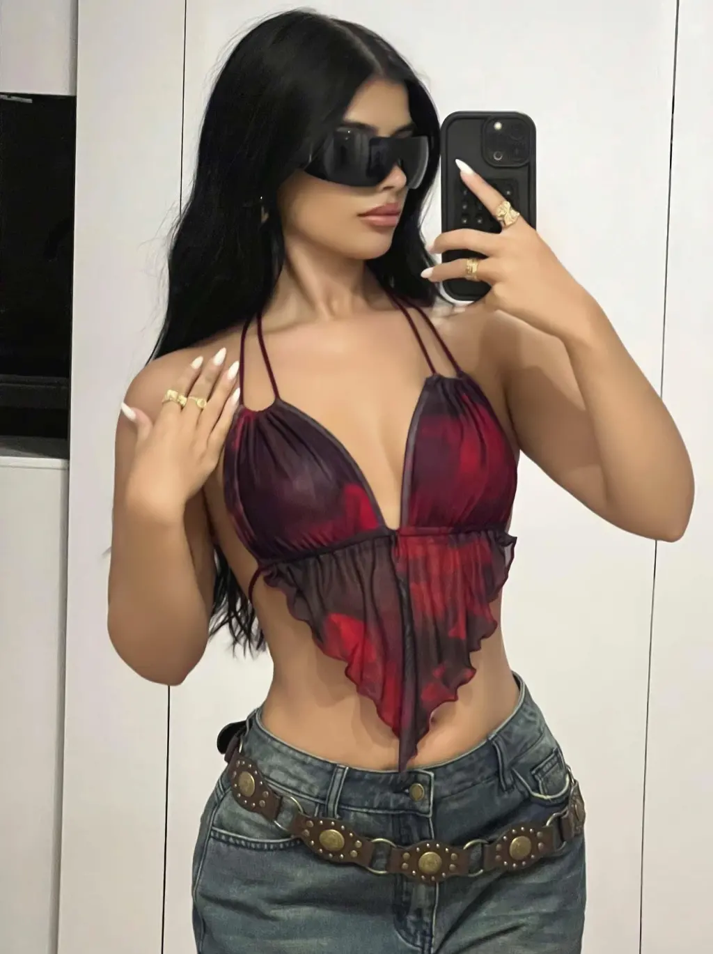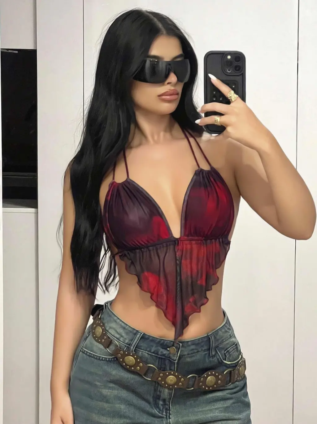 LYYN Kadın Kırmızı Siyah Renklerde Önden Üçgen Kesim Detaylı Crop Askılı Önden Bağlama 5092