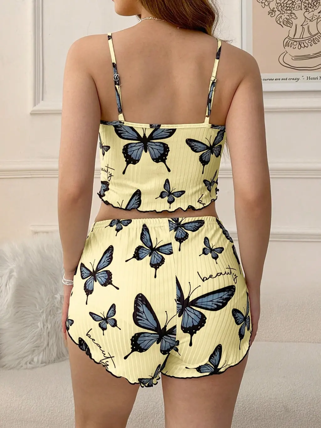 • Kadın Sarı Kelebek Desenli Askılı Şortlu Ribana Pijama Takımı,rahat Ve Şık Ev Giyim,kadın Pijama