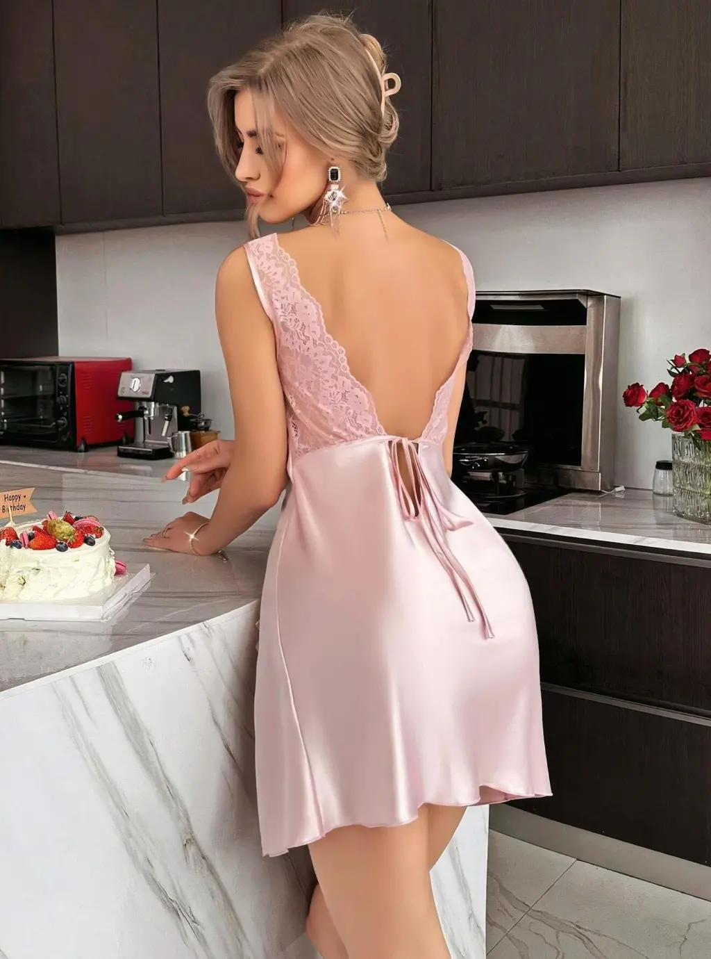 • Kadın Saten Askılı Dantel Detaylı Gecelik - Pudra Pembe 2224