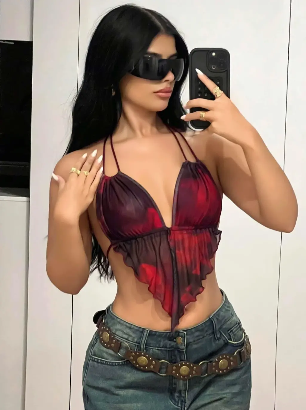 Bu crop top, kırmızı ve siyahın iddialı uyumu ile dikkat çekiyor. İnce askıları ve üçgen kesim tasarımı, vücut hatlarını zarifçe ortaya çıkarırken, desenli yapısı kombine enerji ve karakter katıyor.