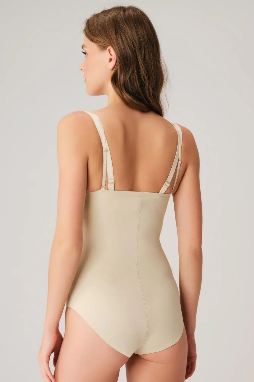 Gün boyu pürüzsüz bir siluet ve maksimum destek sunan bu sıkı badi formundaki ten rengi korse, özel mikro kumaşı sayesinde ikinci ten gibi hissettirir. Göğüs altı yapıştırma detayı ve silikon bantlı paçaları ile yukarı kayma yapmaz, alttan kancalı sistemi sayesinde kolay kullanım sağlar. Elbiselerinizin altında görünmeden kusursuz bir duruş sunar.